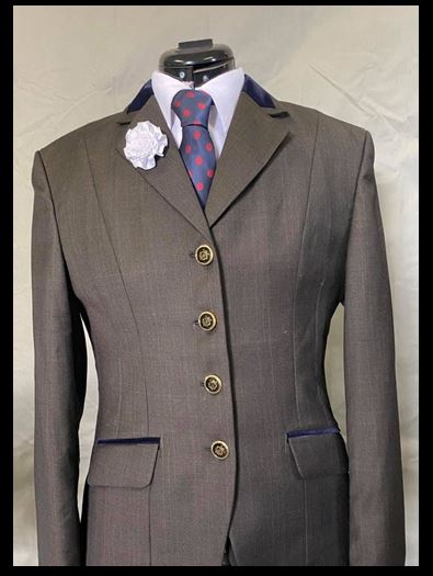 A beautiful Show Hunter jacket made from the highest quality of fabrics, this stunning light weight jacket is fully silk lined, double vented at the back, completed with a 3/4 Navy Velvet collar and Gold buttons down the front ( Fox head buttons available at an additional charge ) Don't miss out on the last of this fabric !!!!